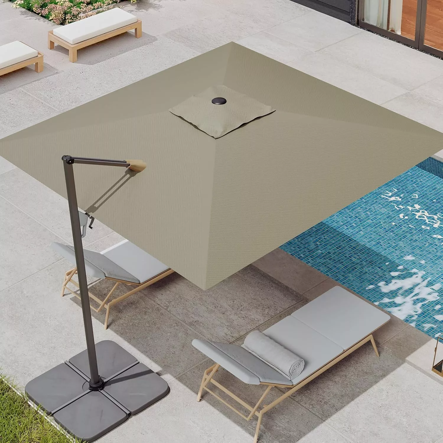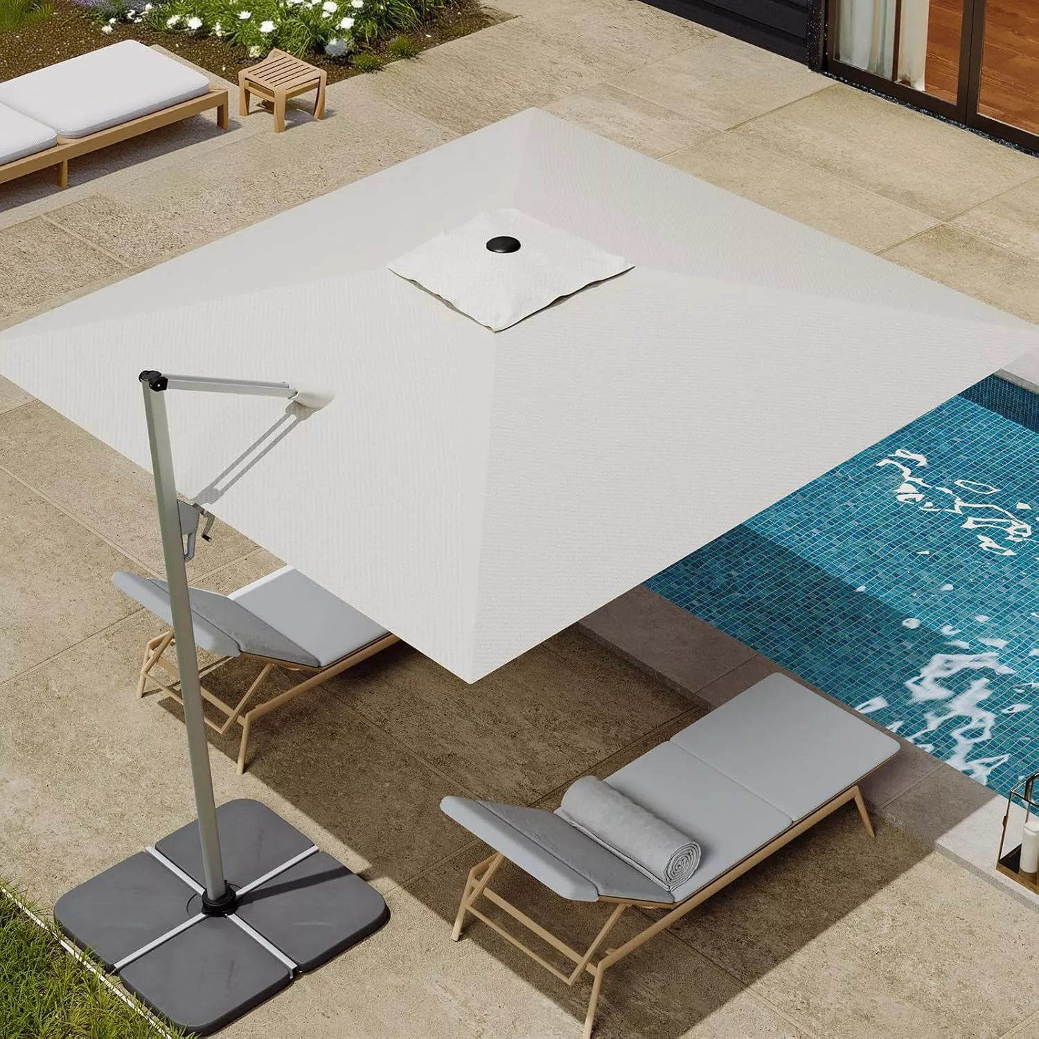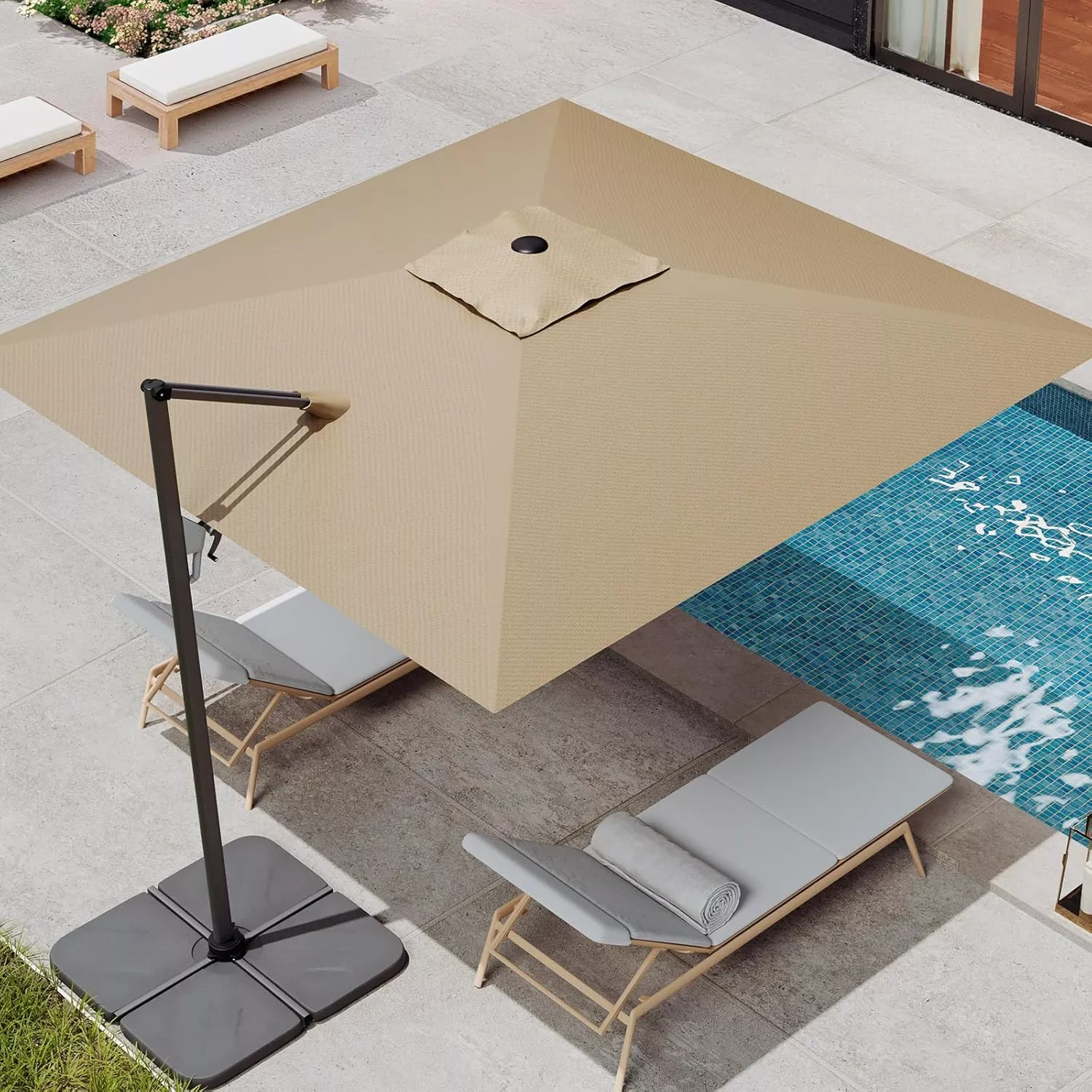 Unlike traditional patio umbrellas, our cantilever design offers an unobstructed shaded area without the hassle of a center pole. The durable aluminum frame is resistant to rust and corrosion, ensuring long-term use. The double-top vent provides better air circulation, reducing wind pressure and keeping the umbrella stable. Whether placed on your patio, deck, or by the pool, this umbrella offers the perfect blend of style and practicality.