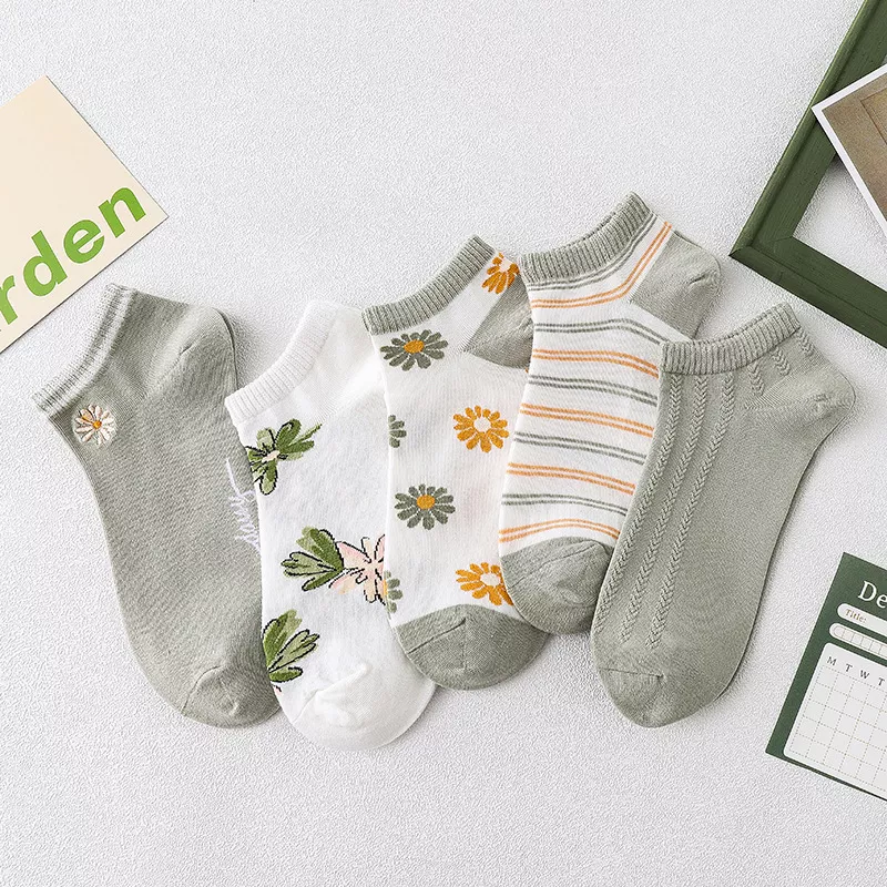 Perfect for those who love cute, nature-inspired designs, these socks feature a charming floral pattern with green leaves, adding a natural flair to any outfit. The low-cut design makes them ideal for pairing with casual shoes, while the thin fabric ensures they’re lightweight and breathable, keeping your feet comfortable without overheating. With five pairs in each pack, you’ll have plenty of stylish and cozy socks to mix and match with all your favorite spring outfits.