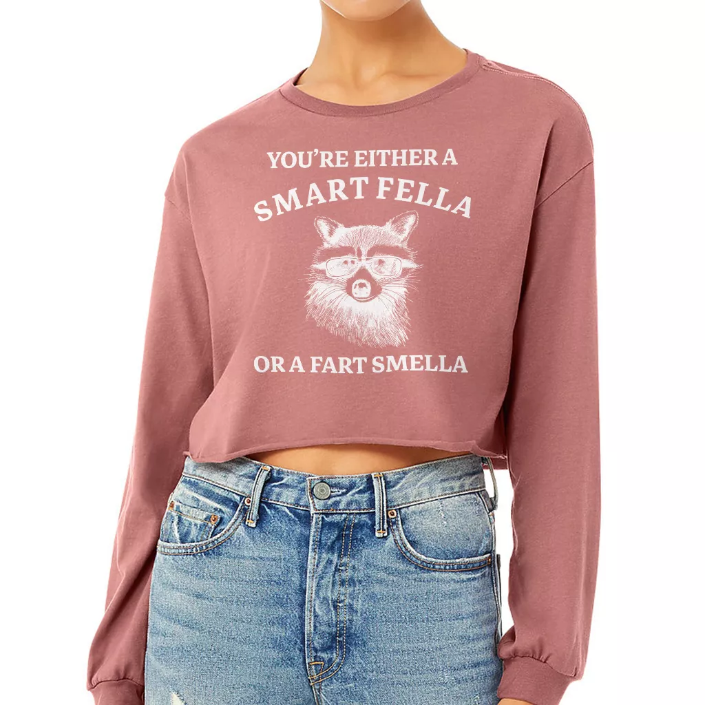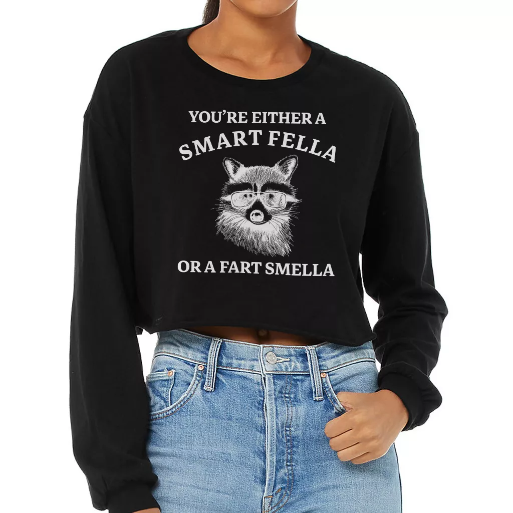 Are You A Smart Fella Or Fart Smella Cropped Long Sleeve Sweatshirt – Raccoon Meme Women’s Crop Top – Funny Long Sleeves Pullover