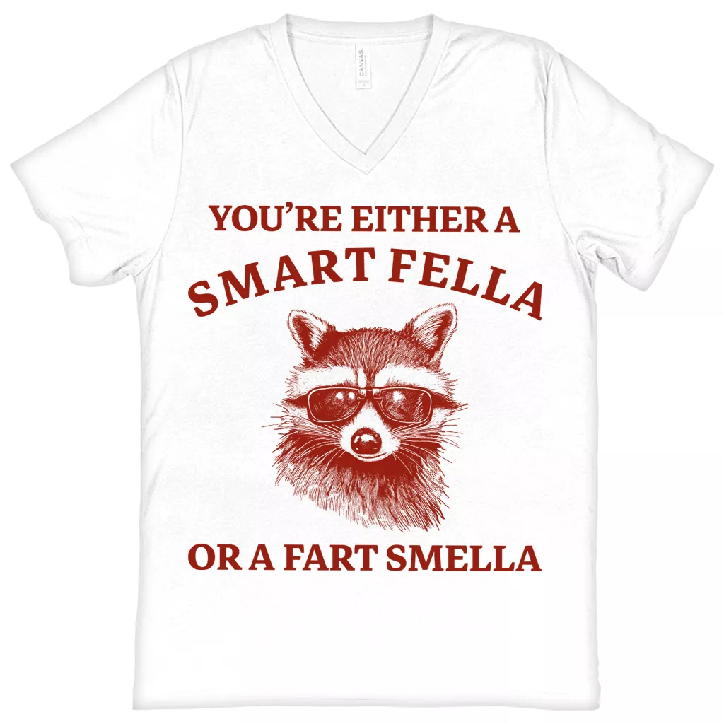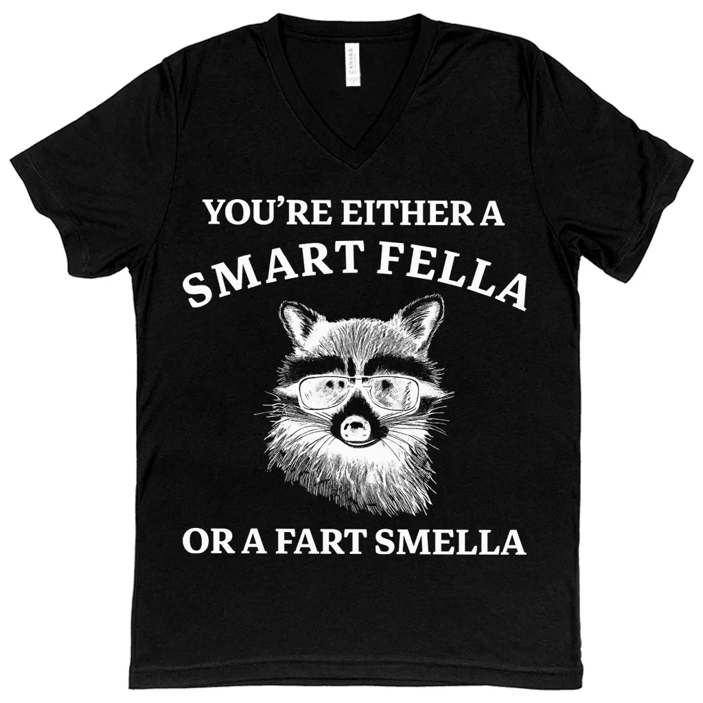 Are You A Smart Fella Or Fart Smella V-Neck T-Shirt – Raccoon Meme Basic T-Shirt – Funny Tee