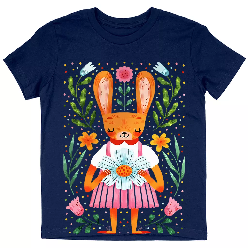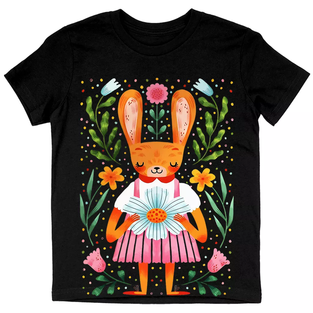 Cute Rabbit Kids’ Cotton T-Shirt – Boho Short Sleeve Tee – Spring Bunny T-Shirt for Kids