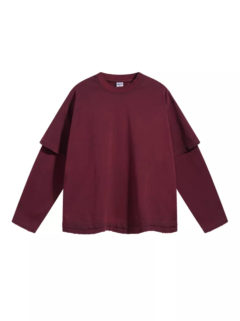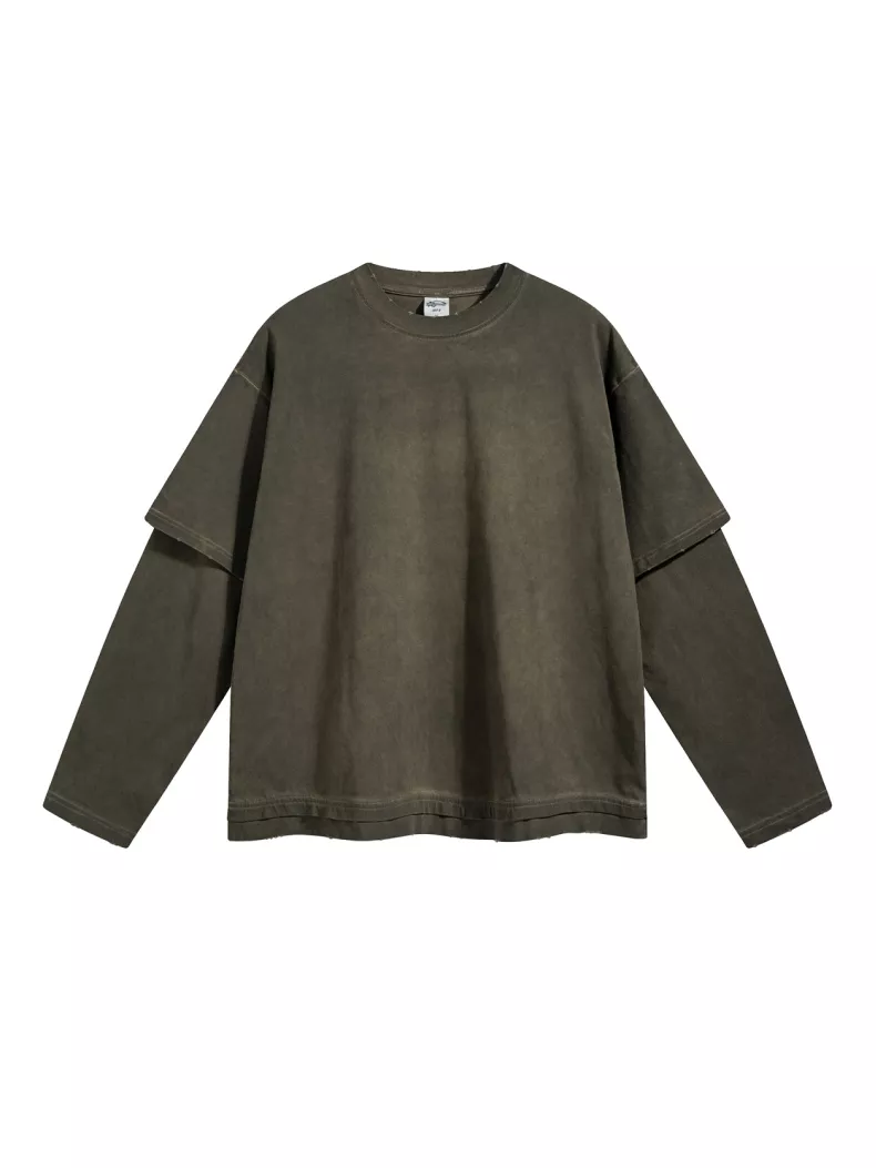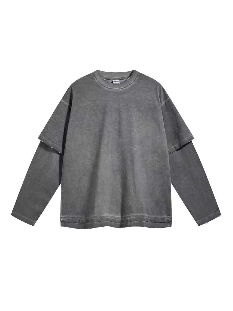 Embrace a laid-back yet trendy look with this pair of dirty, dyed, and worn fake two long-sleeved T-shirts. Perfect for anyone looking to add a bit of edge and style to their wardrobe, these T-shirts blend comfort with street-inspired fashion. Designed to be versatile, they pair effortlessly with your favorite jeans, sweatpants, or shorts for an effortlessly cool vibe.