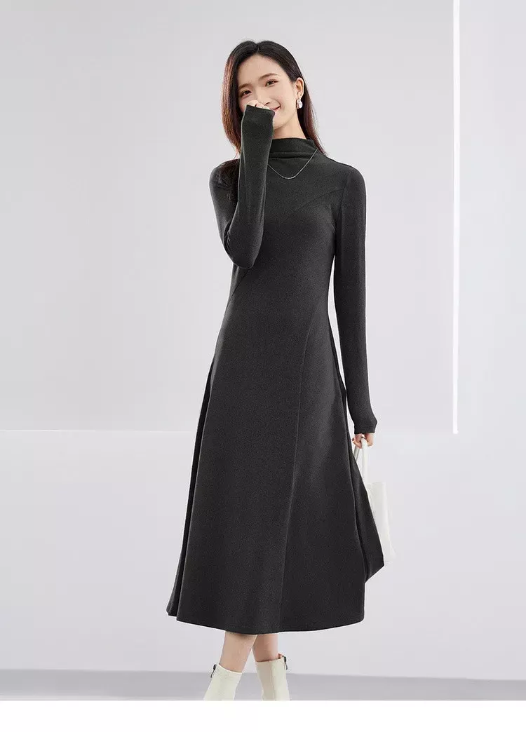 This elegant A-line knitted dress is the perfect addition to your autumn and winter wardrobe. With its slim fit silhouette, half high neck, and long sleeves, it offers both warmth and style. Designed for the modern office lady, this dress brings sophistication to your workwear collection while offering an effortless, flattering fit. The mid-calf length adds a touch of refinement, making it ideal for various occasions, from casual office days to evening events.