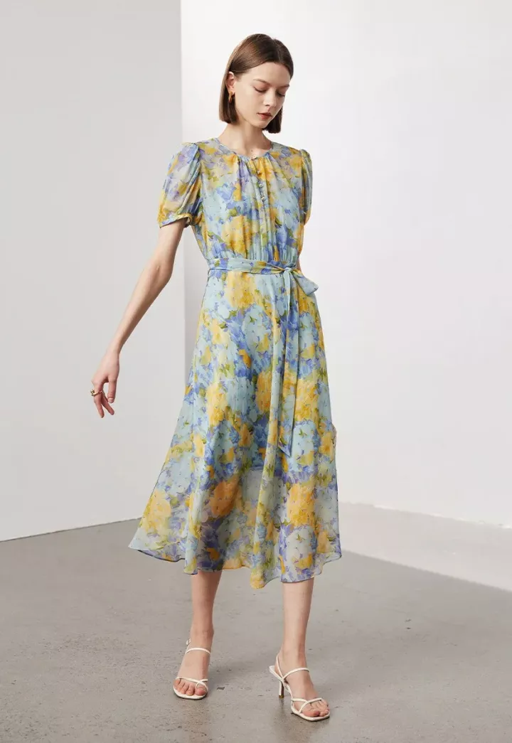 Step into effortless elegance with this 100% real silk floral maxi dress, designed to keep you stylish and comfortable all summer long. The lightweight, breathable mulberry silk drapes beautifully, offering a luxurious feel against your skin. Featuring a flattering A-line silhouette and an eye-catching floral print, this dress is a must-have for your warm-weather wardrobe.