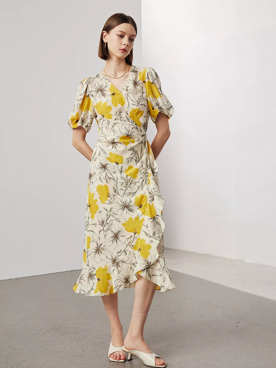 Elegant Floral Silk Midi Dress with V-Neck & Ruffles