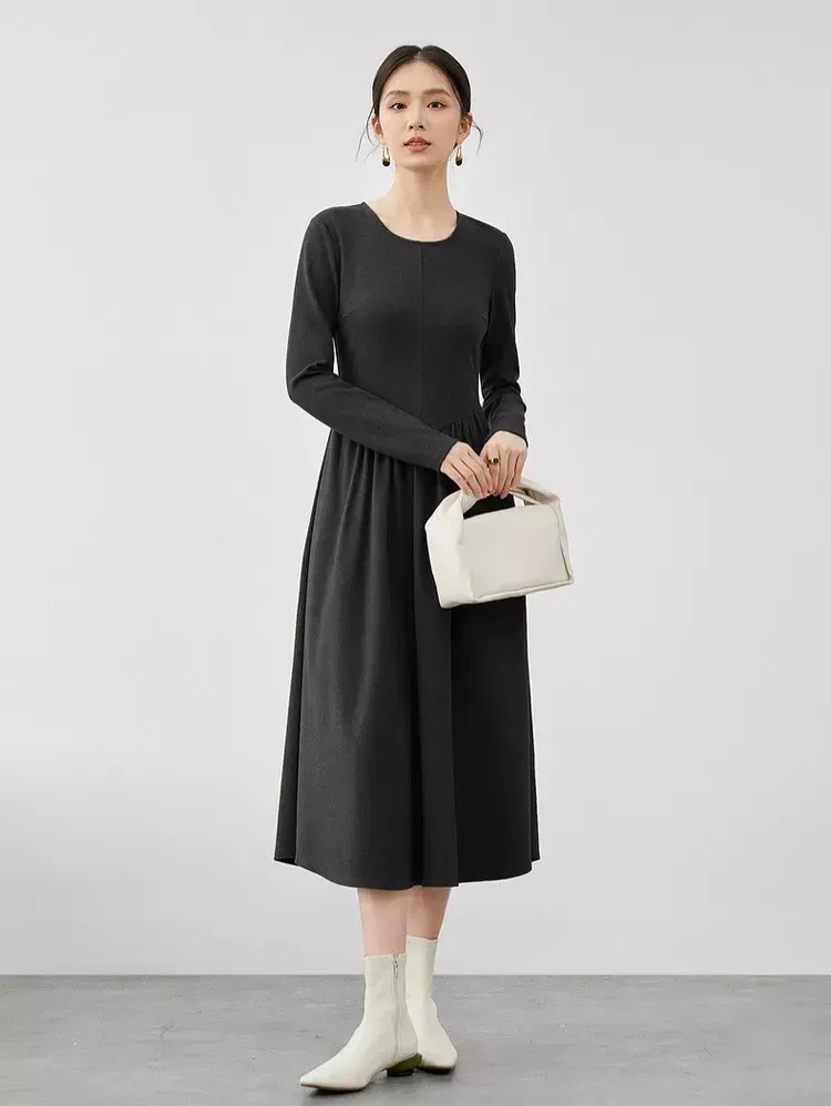 Crafted from a high-quality blend of polyester, spandex, and viscose, this dress offers a soft, breathable, and slightly stretchy feel. The finely knitted fabric ensures both durability and comfort, making it a perfect addition to your cold-weather wardrobe. The O-neckline and long sleeves provide a modest yet modern look, while the solid black color adds a touch of refined elegance.