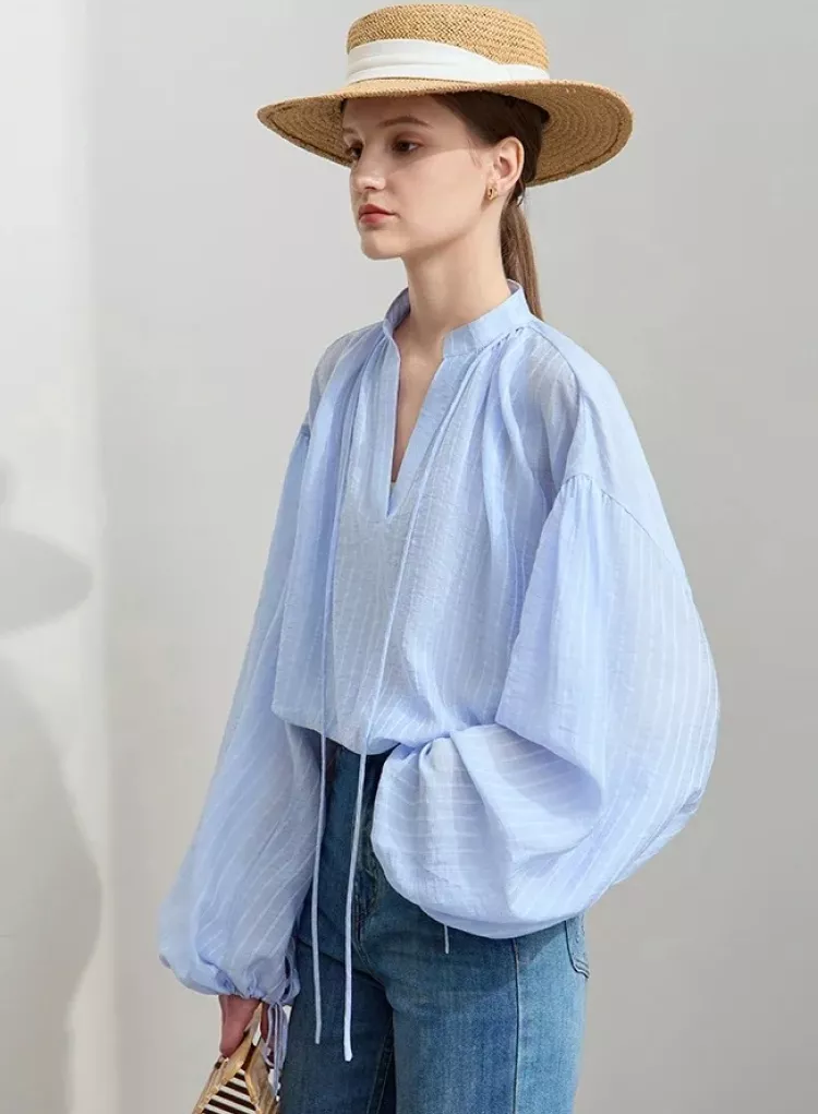 This blouse stands out for its timeless design and elegant details. The lantern sleeves and lace-up accent make it a unique and stylish piece that’s perfect for layering or wearing on its own. The loose fit ensures that it’s comfortable without sacrificing style. Whether you’re at the office or enjoying a day off, this versatile top will have you looking and feeling great.