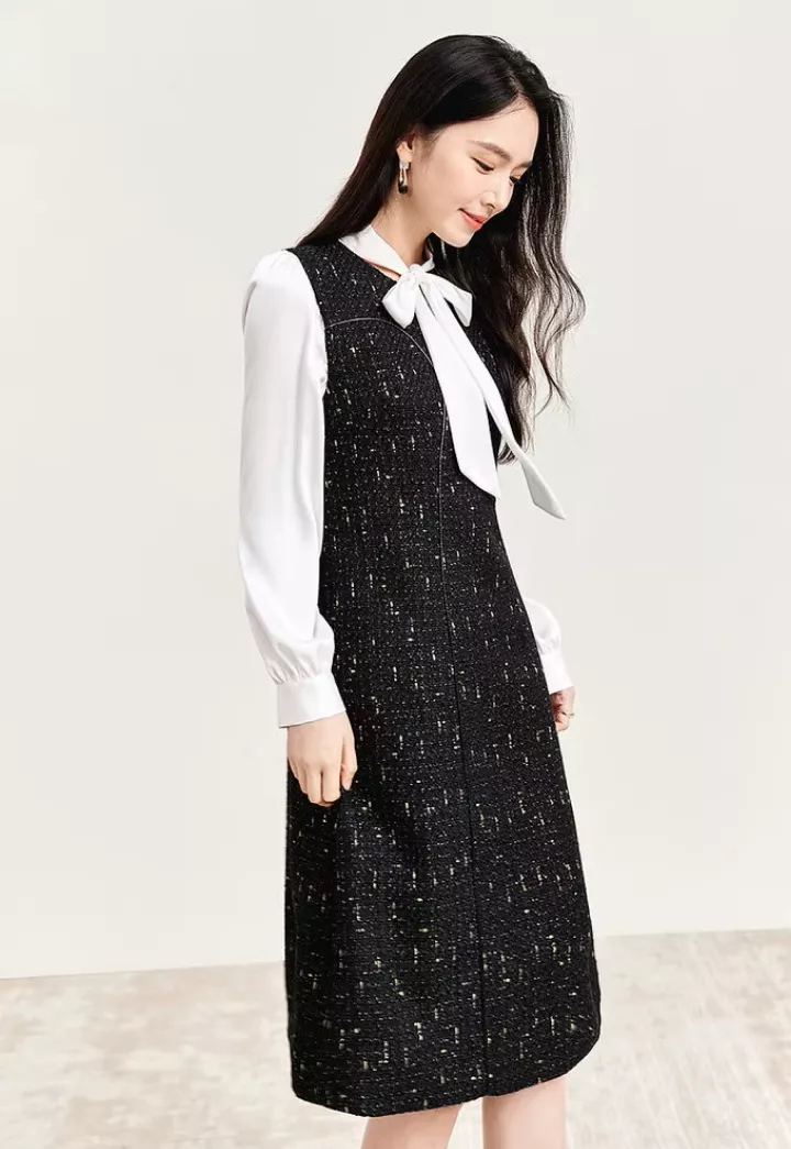 This dress is the perfect addition to your wardrobe for any season. Its tweed material provides warmth during autumn and winter while remaining breathable for indoor settings. Whether you’re heading to a corporate event, an elegant dinner, or a special occasion, this dress ensures you stand out in style.