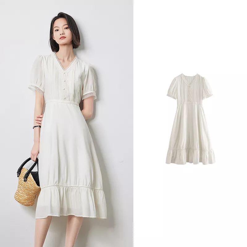 Elegant White Chiffon Lace Dress – V-Neck, Puff Sleeve, A-Line Silhouette