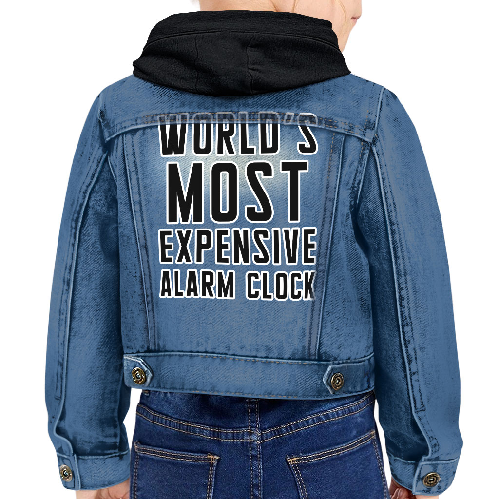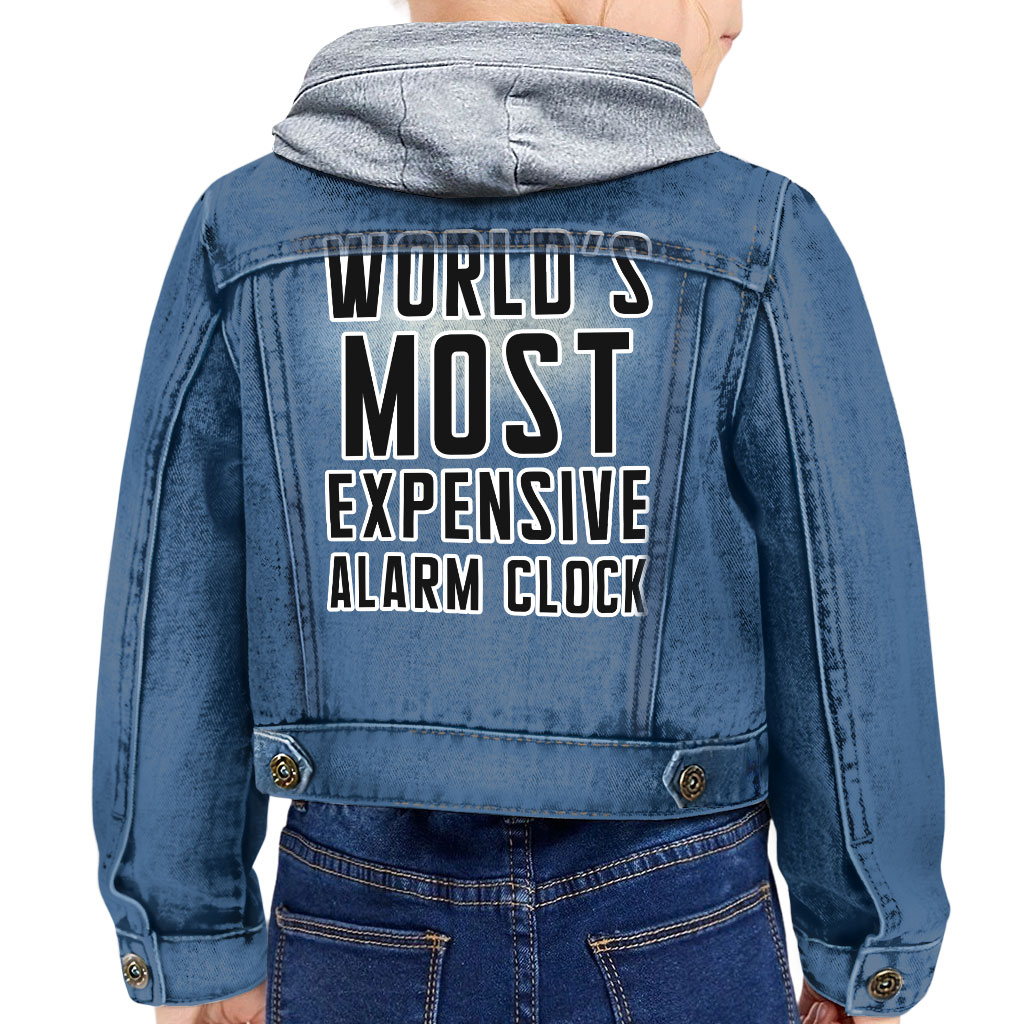 Expensive Alarm Clock Toddler Hooded Denim Jacket – Best Design Jean Jacket – Trendy Denim Jacket for Kids