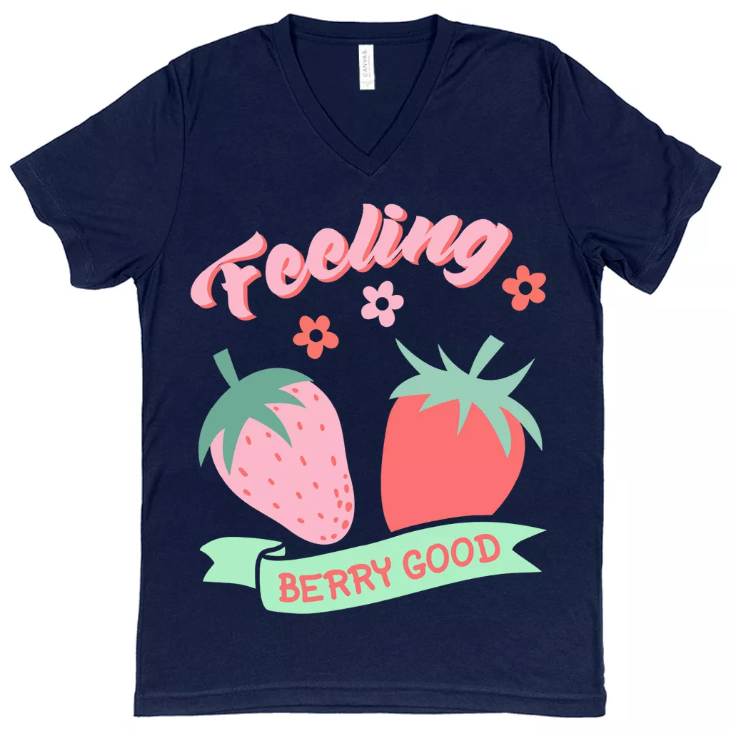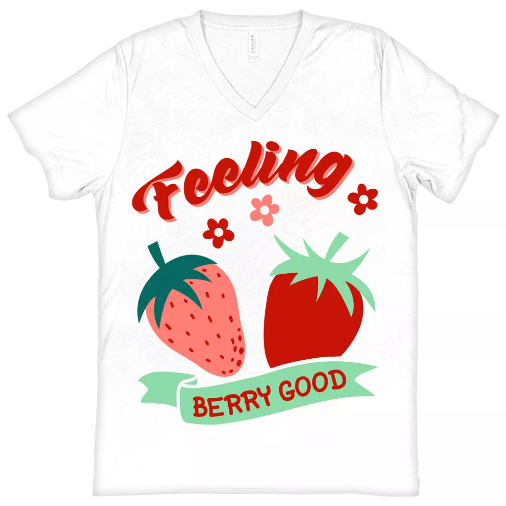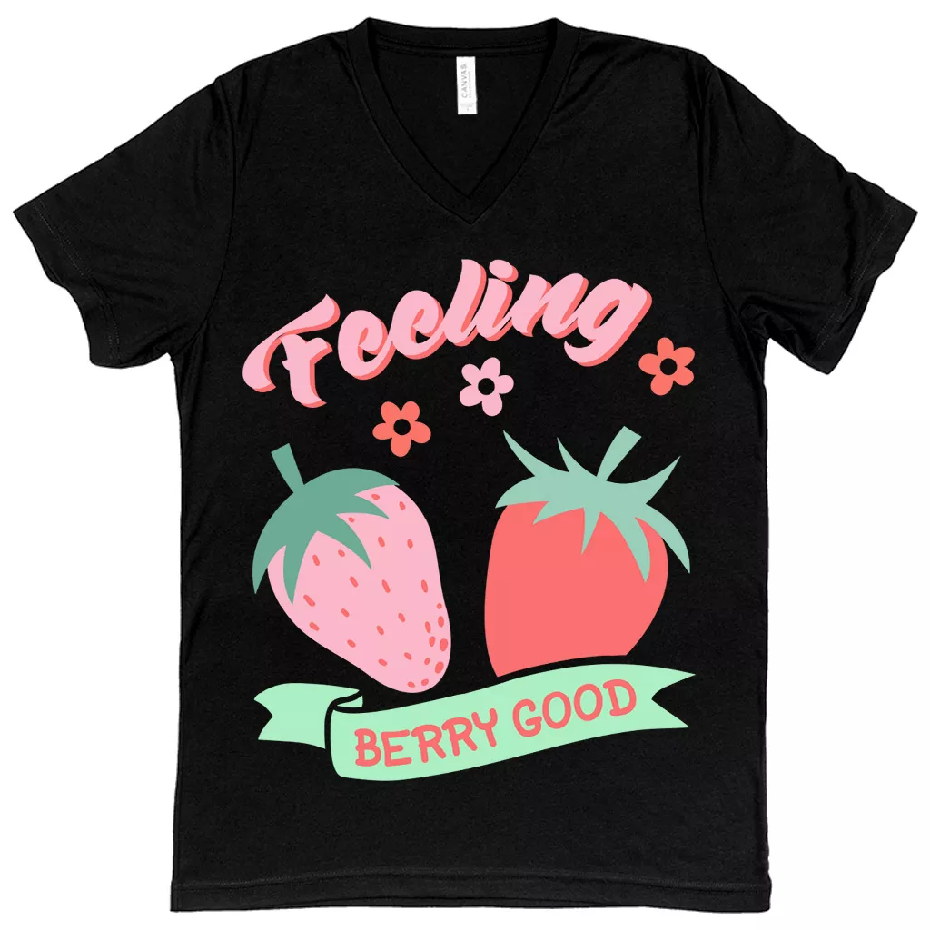 Feeling Berry Good V-Neck T-Shirt – Retro Strawberry Basic T-Shirt – Pink Graphic Tee