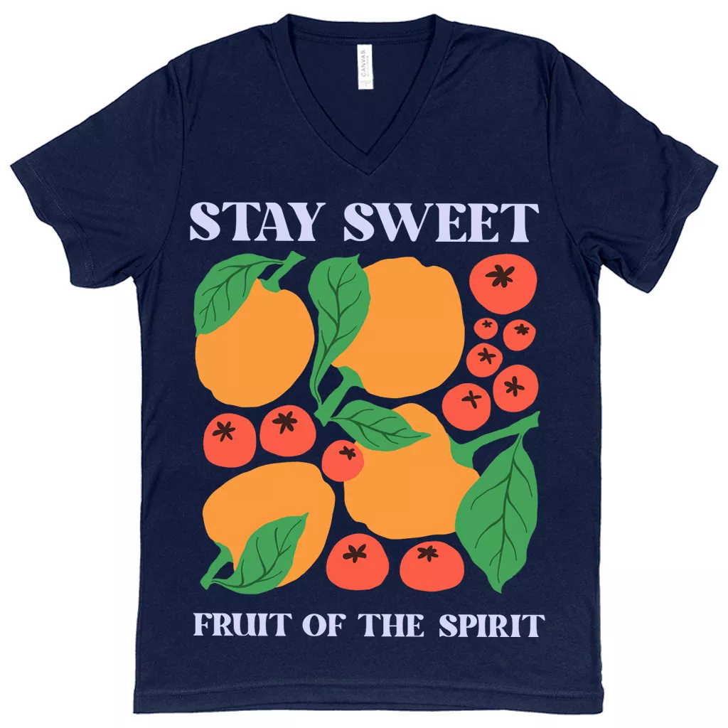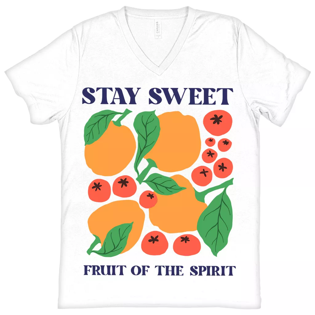 Fruit Of the Spirit V-Neck T-Shirt is proudly made with 7x less water than average manufacturers, in recycle-friendly facilities that also guarantee zero sweatshop conditions