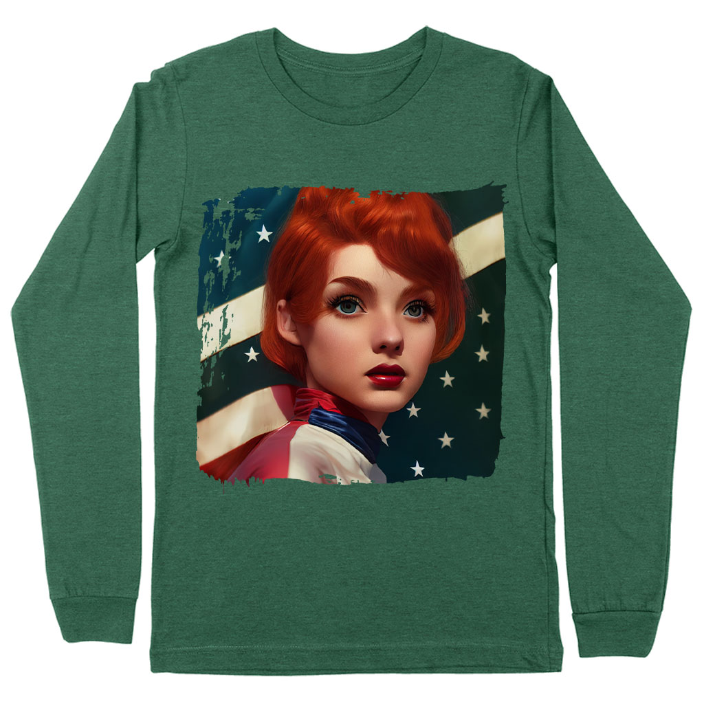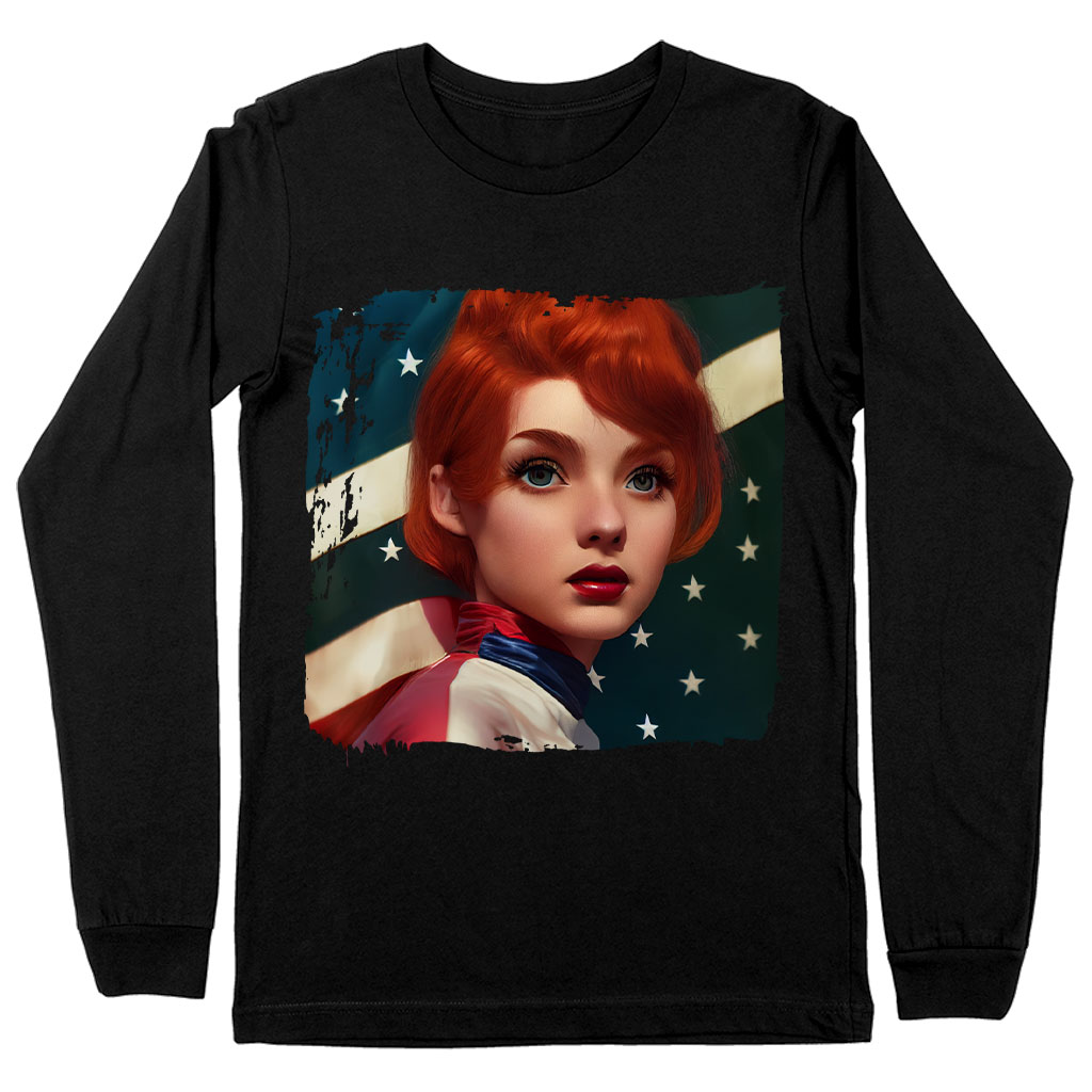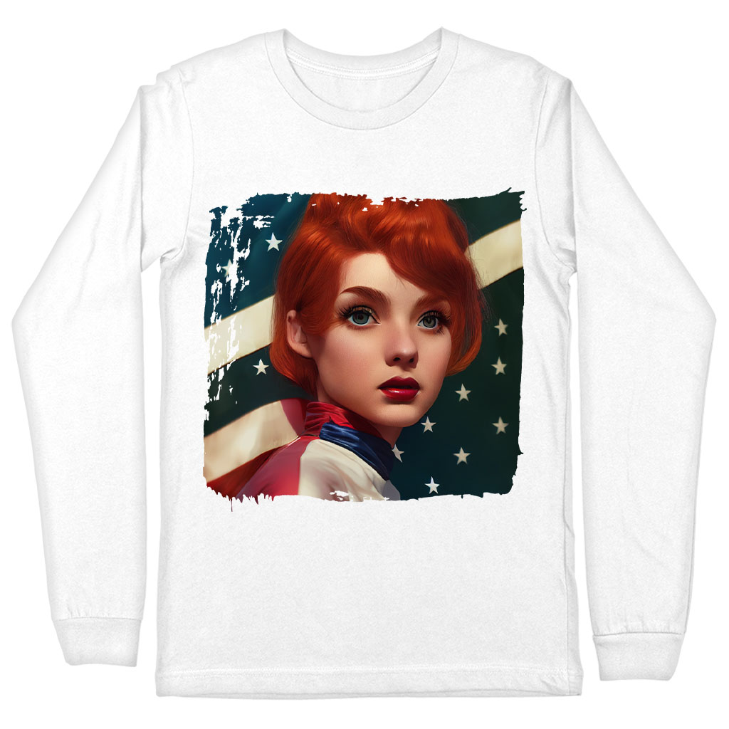 Girl Red Hair American Flag Long Sleeve T-Shirt – Art T-Shirt – Cool Long Sleeve Tee Shirt