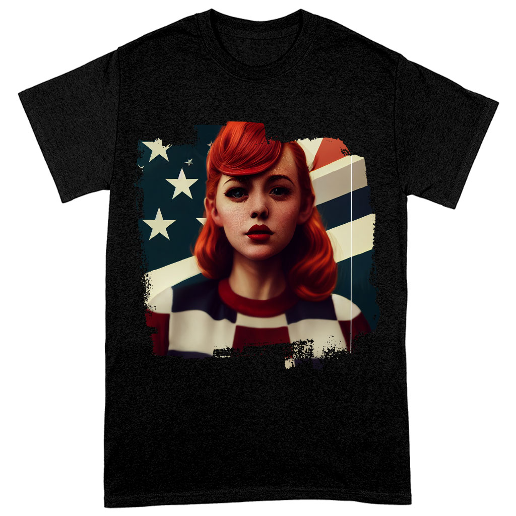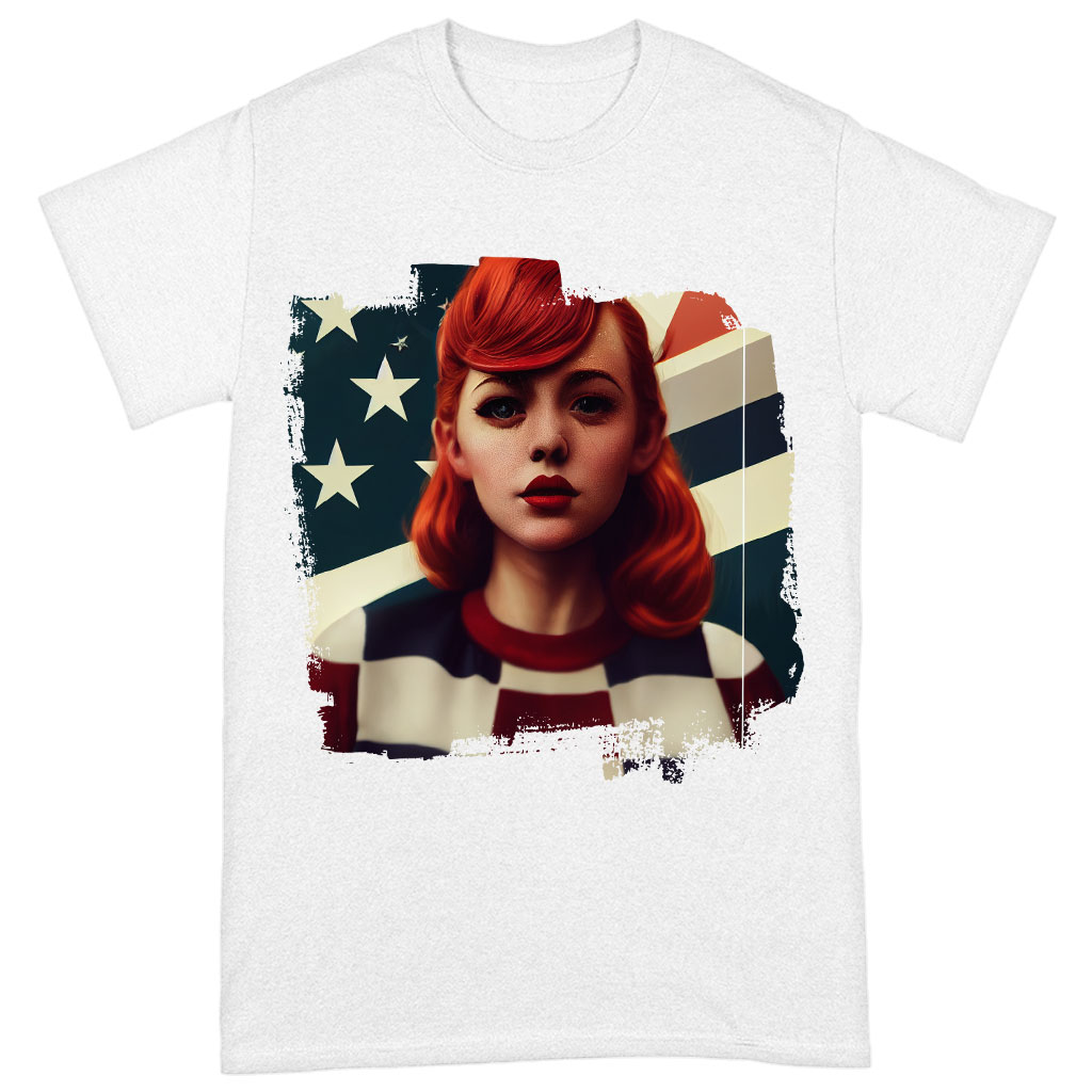 Girl Red Hair American Heavy Cotton T-Shirt – Patriotic Tee Shirt – Art T-Shirt