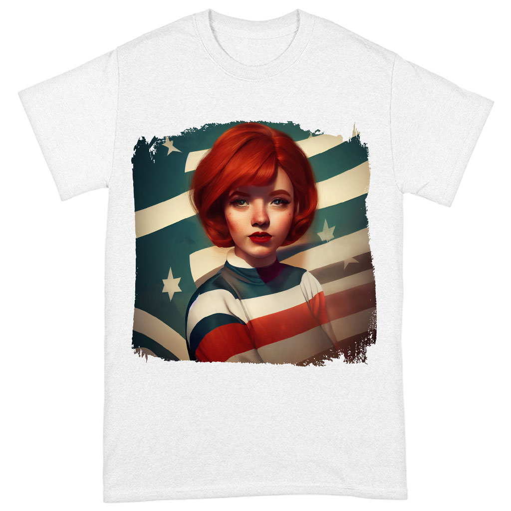 Girl With Red Hair American Flag Heavy Cotton T-Shirt – Print Tee Shirt – Flag T-Shirt