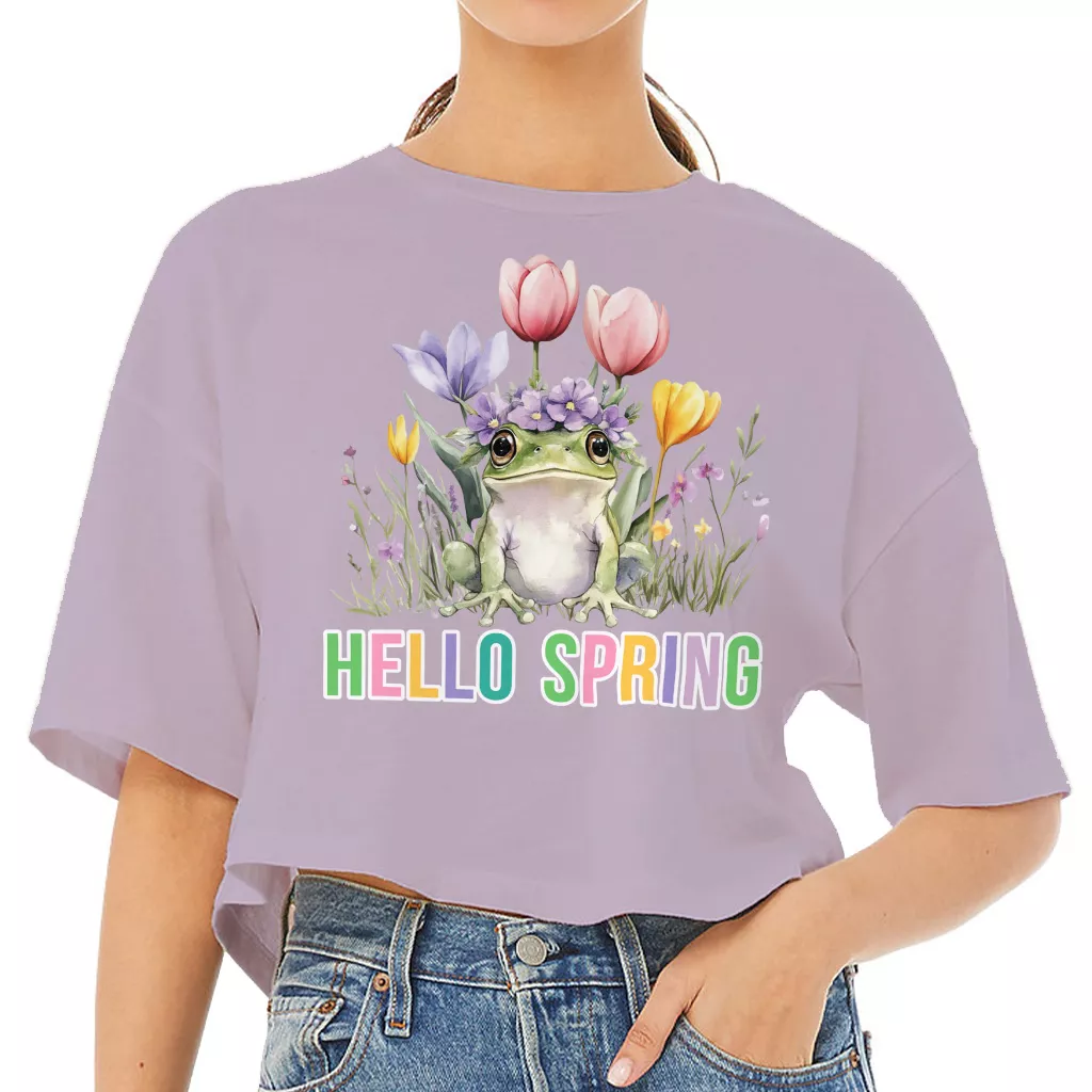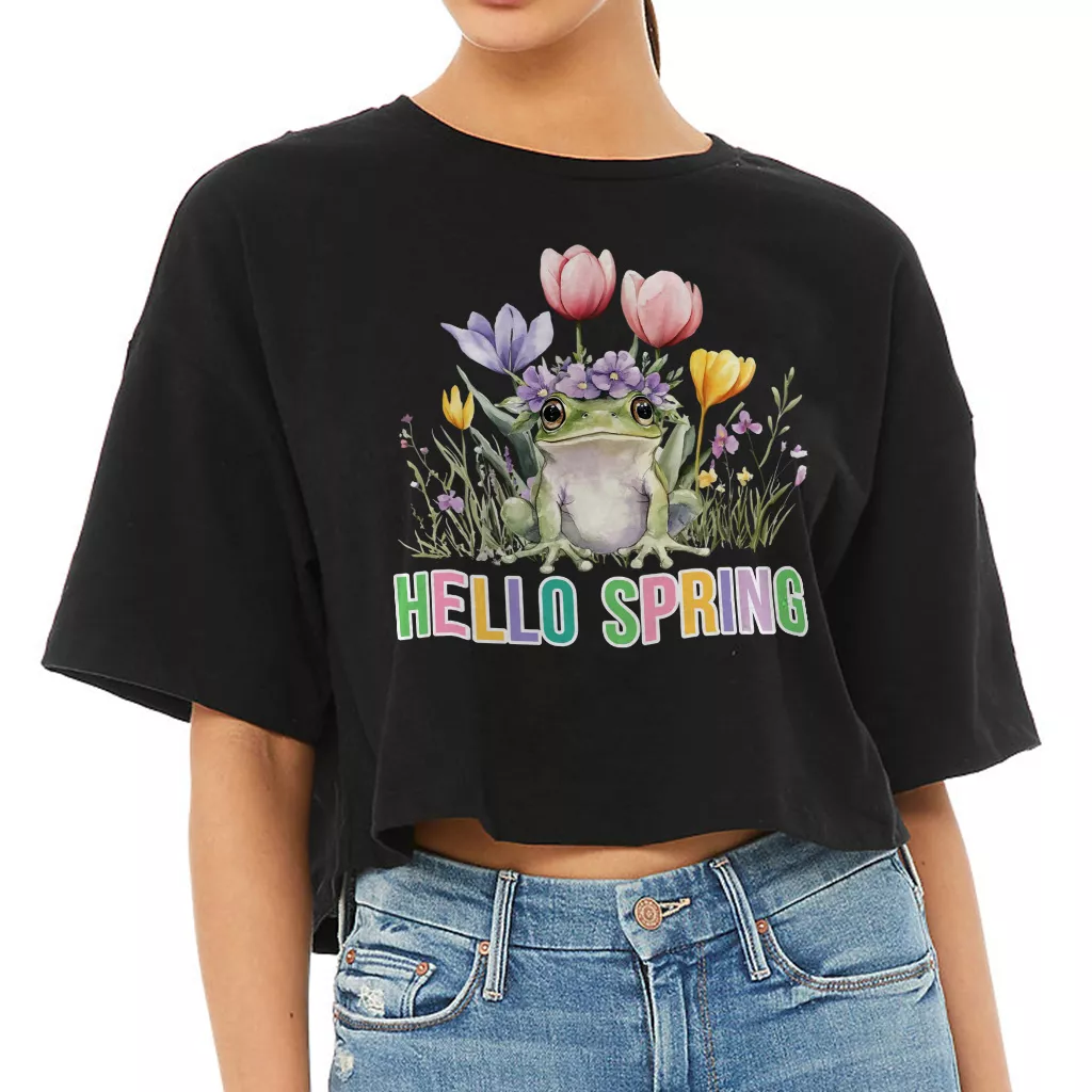 Hello Spring Frog Cropped T-Shirt – Springtime Trendy Tee – Cute Frog Women’s Basic T-Shirt