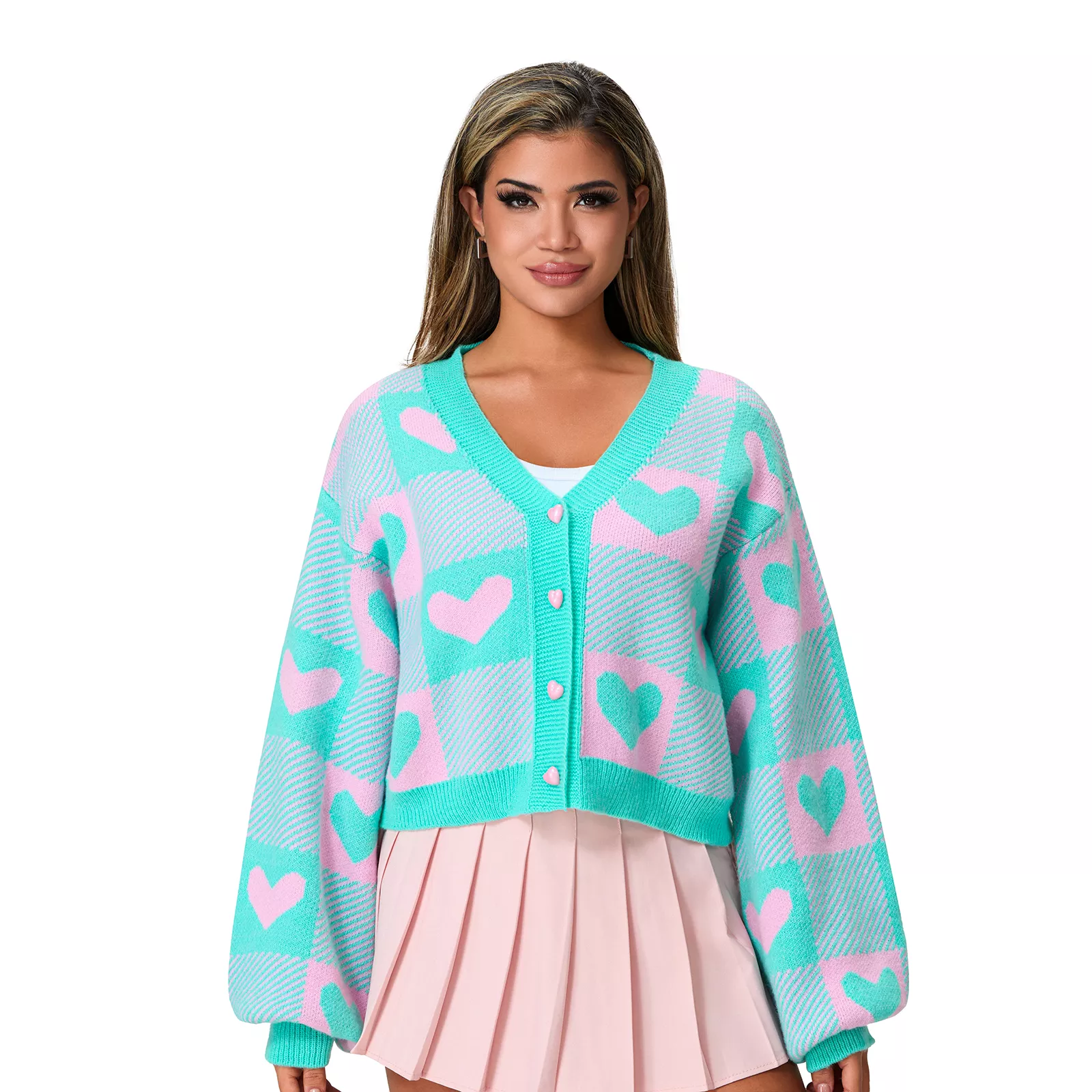 Long Sleeve V-Neck Button-Up Heart Print Knitwear Sweater Cardigan for Women