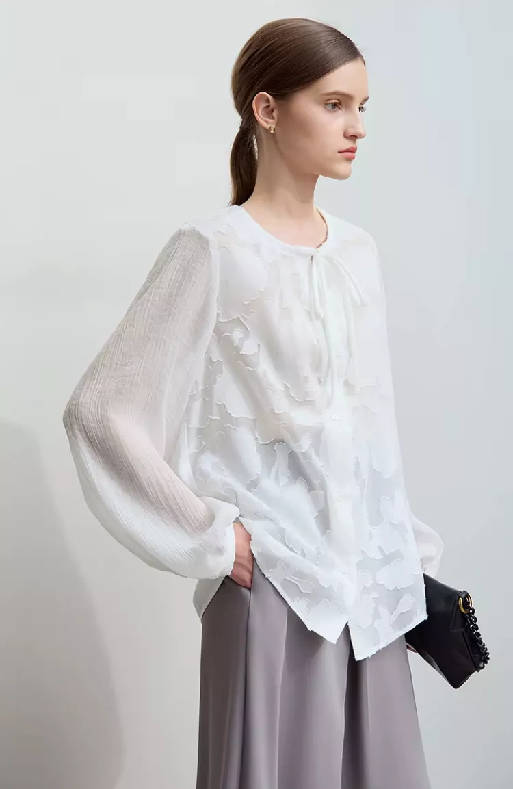 Designed with the modern woman in mind, this blouse is the perfect balance between comfort and elegance. The breathable chiffon fabric allows for all-day wear, while the lantern sleeves offer a flattering, feminine silhouette. The O-neck collar provides a classic, refined look, while the shirring and drawstring details add a unique twist. This blouse is not only stylish but also practical, with its relaxed fit allowing for ease of movement.