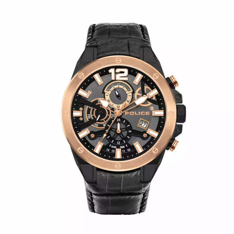 Police Black Stainless Steel Quartz Watch with Leather Strap