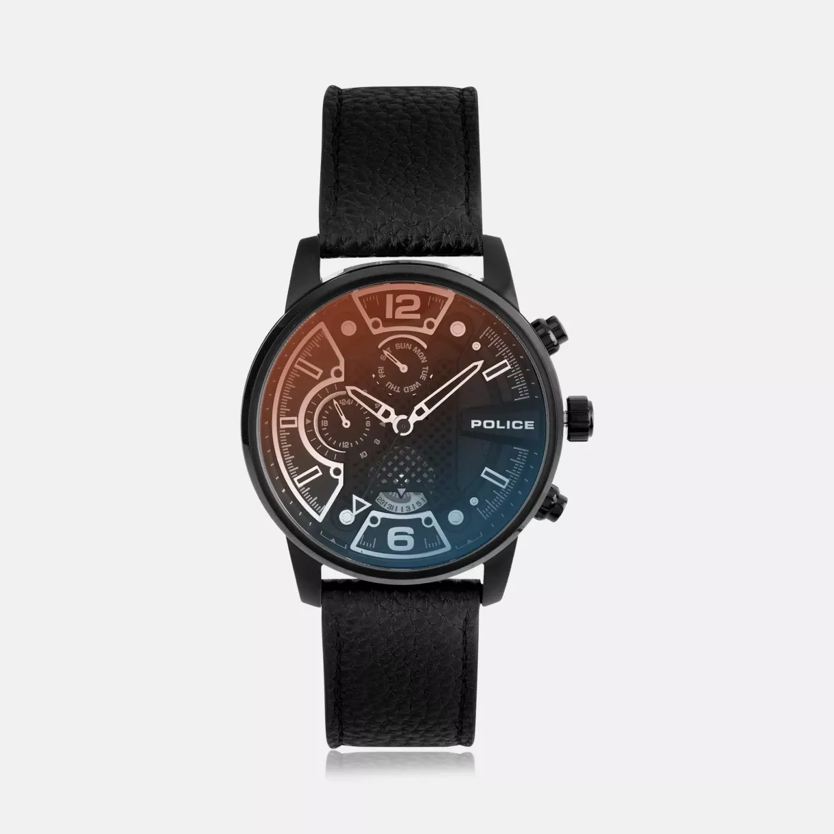 Police Men’s Analog Quartz Watch with Gray Stainless Steel Case and Black Leather Strap