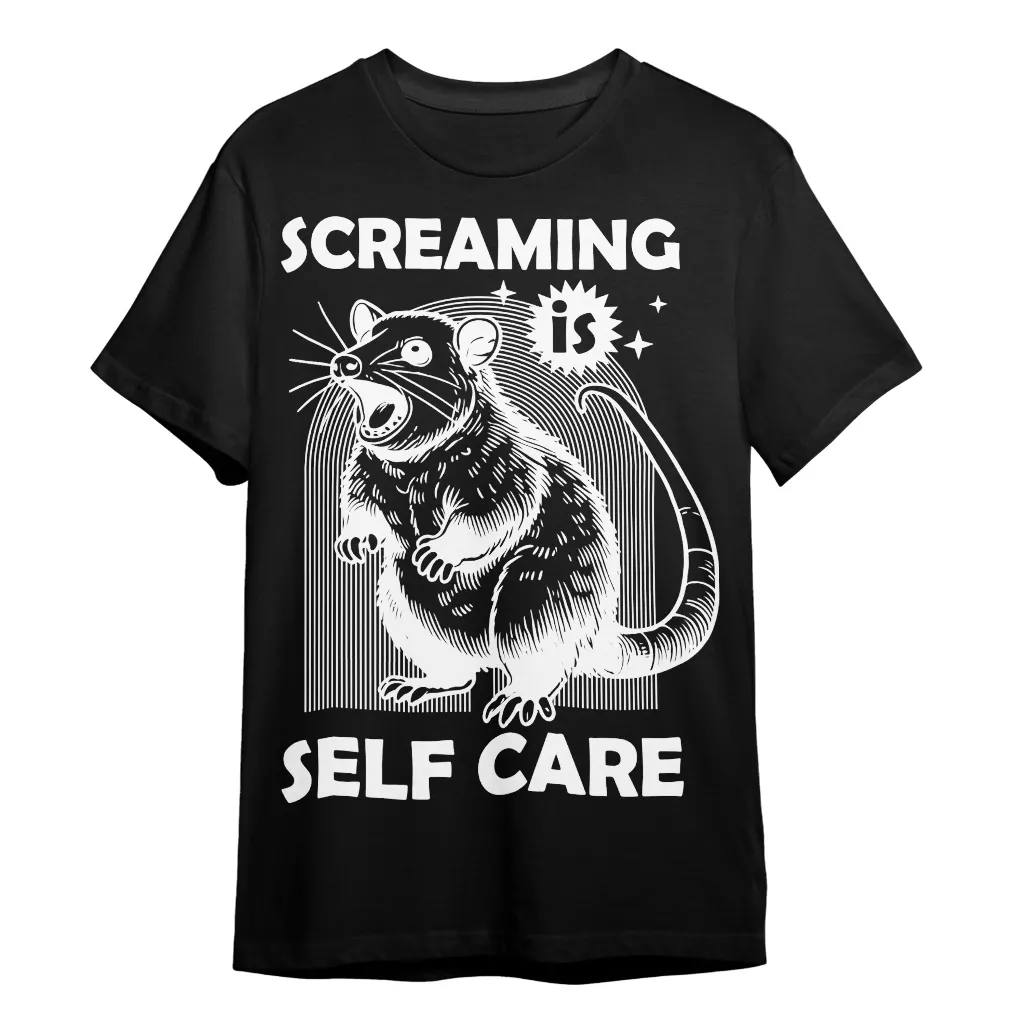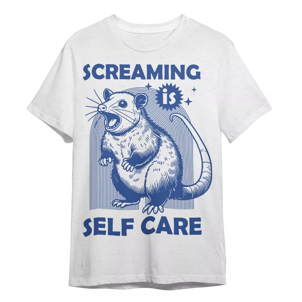 Screaming Is Self Care T-Shirt is no ordinary piece of clothing. Its taped neck and shoulders, double-needle sleeve and bottom hems, and quarter-turned construction provide a retail fit for clothing that’s true to size. Possum Heavy Cotton Tee is Designed and printed in California.