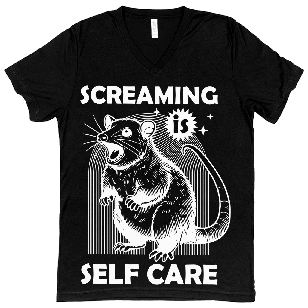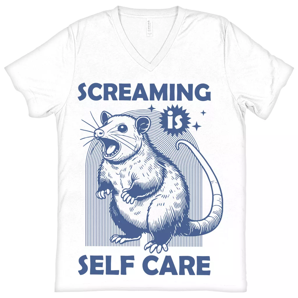 Screaming Is Self Care V-Neck T-Shirt – Possum Basic T-Shirt – Animal Humor Tee