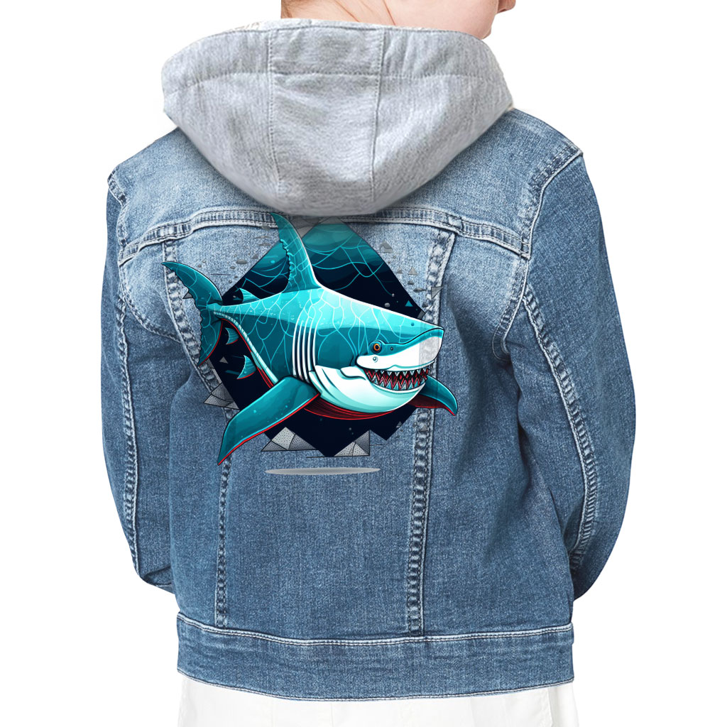 Shark Print Hooded Denim Jacket for Kids – Cool Art Jean Jacket – Best Design Denim Jacket for Kids