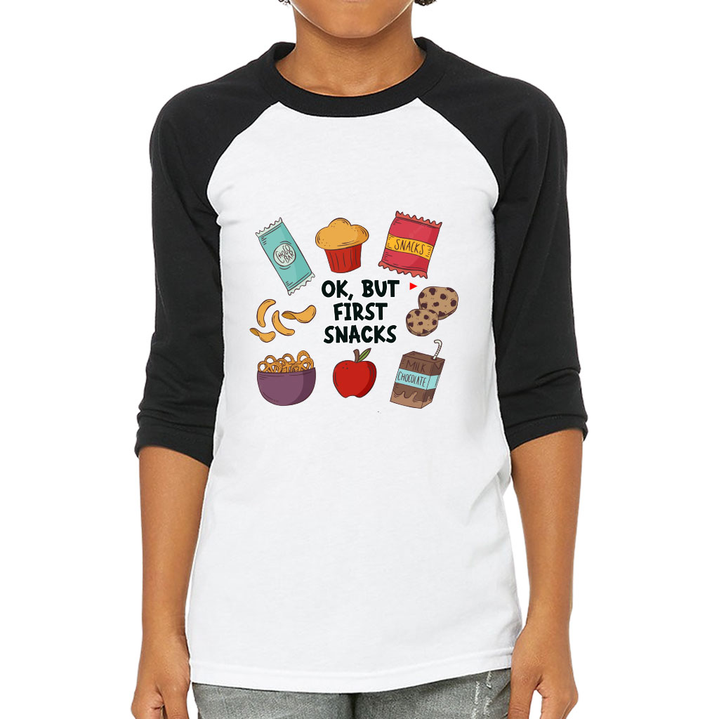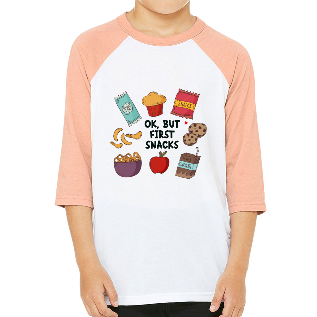 Snacks Kids’ Baseball T-Shirt – Graphic 3/4 Sleeve T-Shirt – Kawaii Baseball Tee