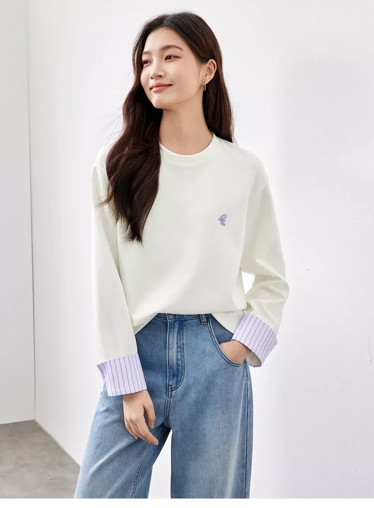 Elevate your spring wardrobe with this stylish and cozy spliced cotton sweatshirt. Designed with comfort and casual elegance in mind, this top combines a relaxed fit with a sophisticated embroidered patchwork design. Perfect for commuting, office days, or a weekend outing, this sweatshirt is ideal for modern women looking for a balance of comfort and style.