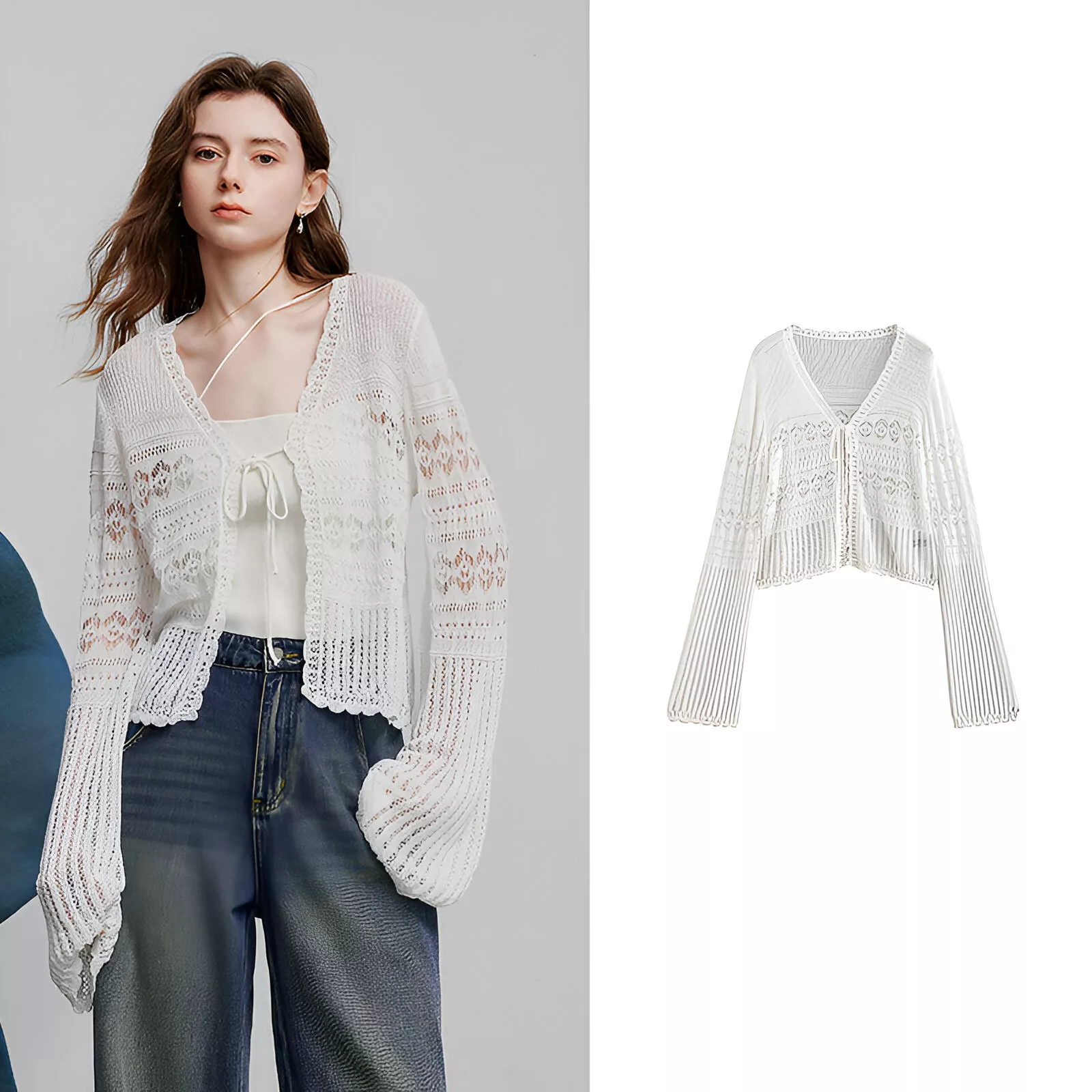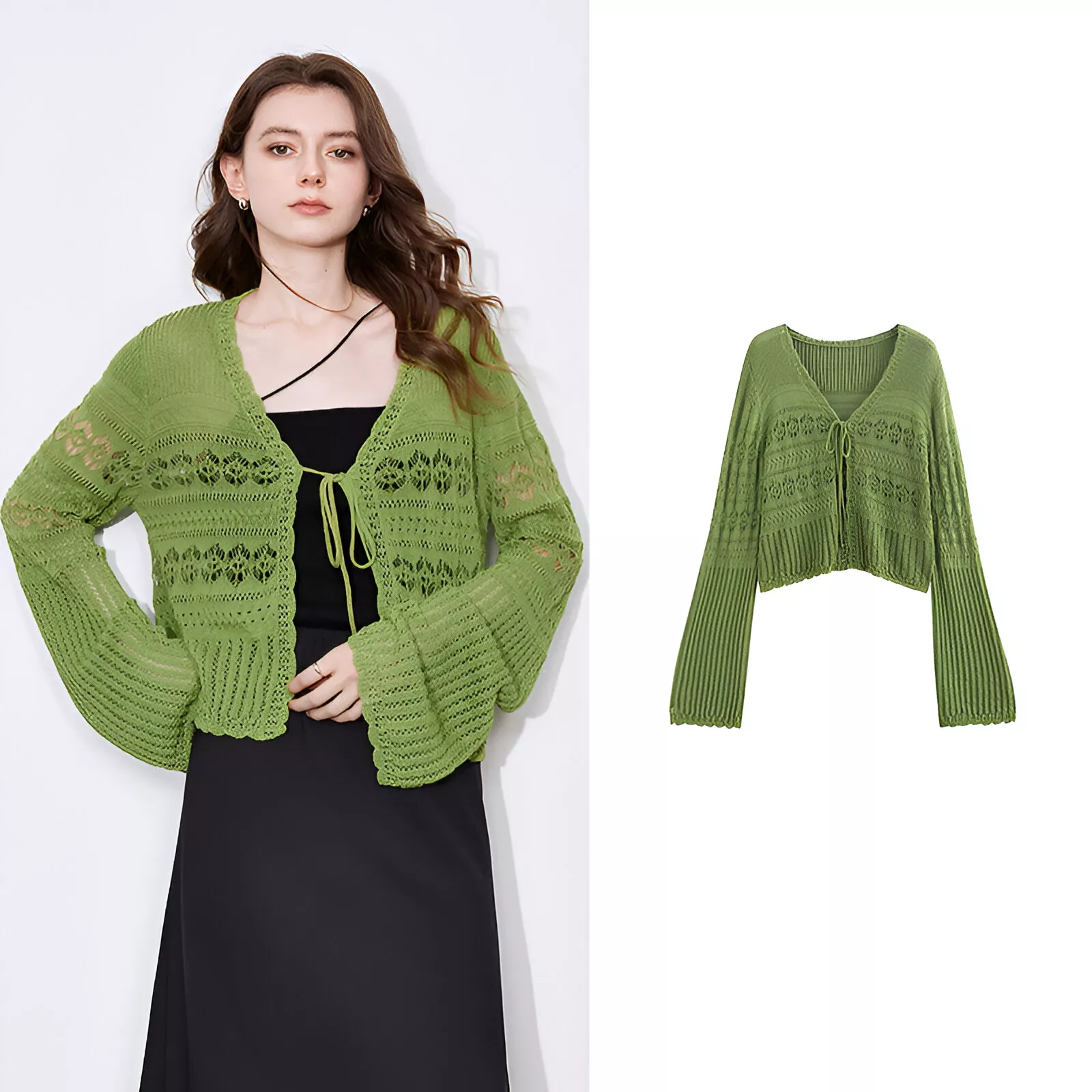 What sets this cardigan apart is its elegant simplicity. The imitation linen texture offers a luxurious feel without the fuss, while the hollow out details create a delicate, airy aesthetic. This piece is designed for women who appreciate timeless fashion with a contemporary twist. The short length and regular fit make it flattering for all body types, and the versatile design means you can dress it up or down with ease.