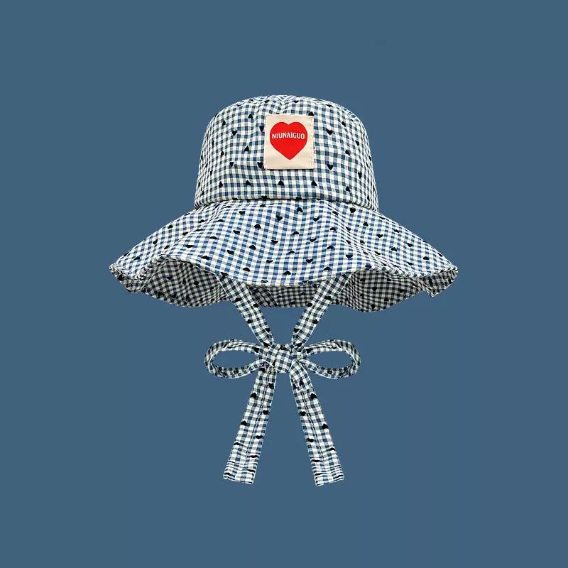 Sweet Love Plaid Streamer Bucket Hat – Foldable Wide-Brim Sun Hat for Women