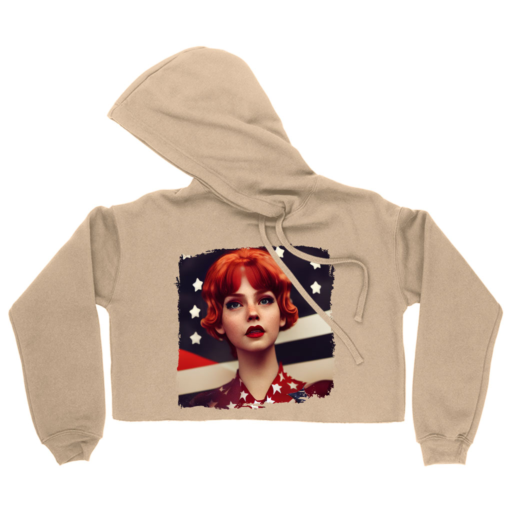 USA Flag Print Women’s Cropped Fleece Hoodie – Girl Art Cropped Hoodie for Women – Patriotic Hooded Sweatshirt