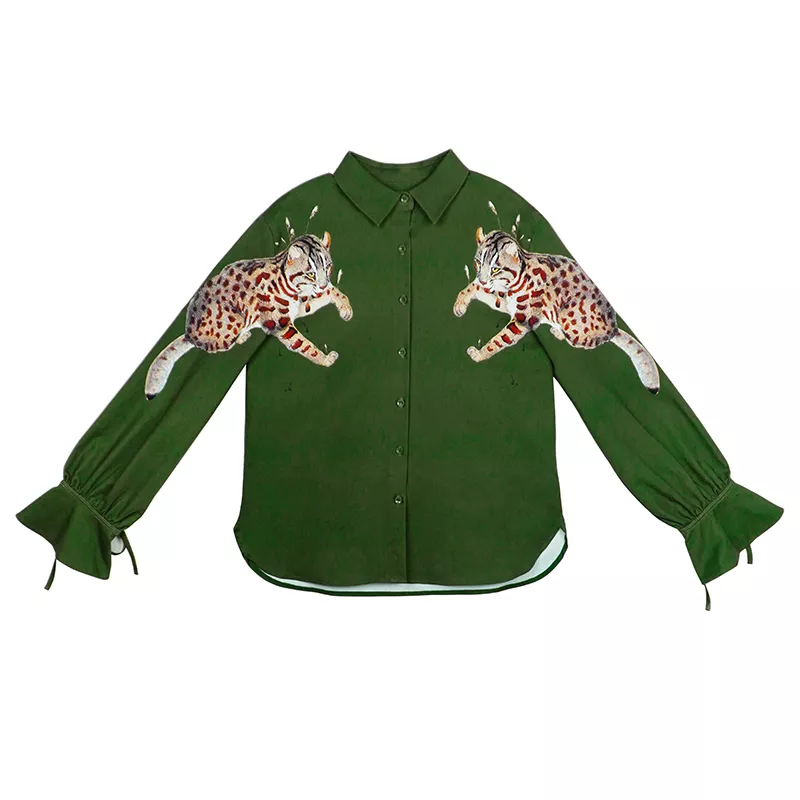 This blouse is designed to fit and flatter. With a loose, relaxed silhouette, it offers freedom of movement without compromising on style. The turn-down collar and ruffle details add a touch of vintage charm, while the classic single-breasted closure ensures easy wear. The animal-inspired leopard print jacquard pattern adds a bold statement, allowing you to express your unique style.