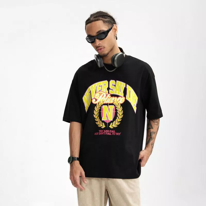 taped neck and shoulders, double-needle sleeve and bottom hems, and