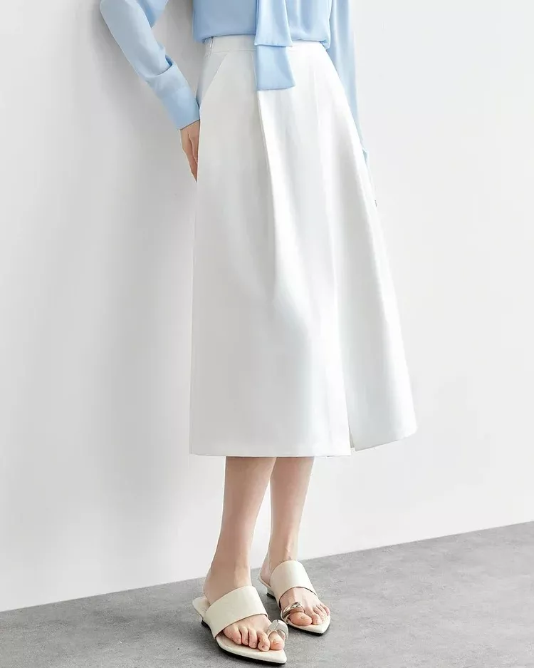 This skirt stands out with its modern details, like the fold design and slit hem, offering a stylish and contemporary twist on a classic wardrobe staple. The natural waistline gives you a flattering shape, while the A-line silhouette ensures a flowy, relaxed fit. Whether you pair it with a casual top for a laid-back look or dress it up with a blouse for an office-ready outfit, this skirt is as versatile as it is fashionable.