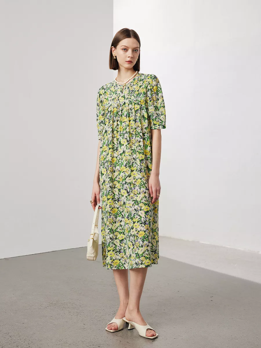 This floral silk dress stands out for its luxurious fabric and timeless design. Its A-line silhouette and O-neck make it both flattering and comfortable, whether you’re strolling through a park or attending a casual event. The loose waistline gives the dress a relaxed, breezy feel, making it ideal for warm spring and summer days. The floral print in yellow-green adds a refreshing burst of color, evoking the beauty of blooming gardens and sunny afternoons.