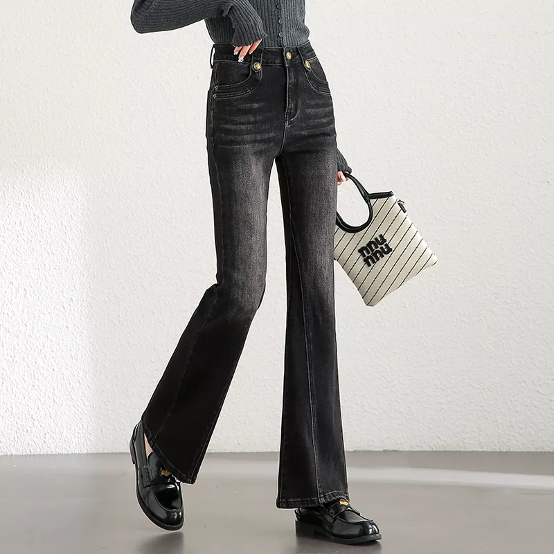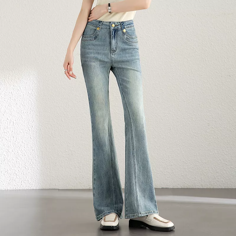 Designed to hug your curves, these skinny-fit jeans feature a structured yet comfortable mid-rise waist that enhances your silhouette. The flared leg adds a touch of retro elegance, making them perfect for pairing with heels, boots, or sneakers. Detailed with vintage-inspired metal buttons, pockets, and subtle fake zippers, these jeans combine practicality with stylish accents. The high-quality cotton denim fabric ensures breathability and durability, making them a staple for autumn and winter fashion.