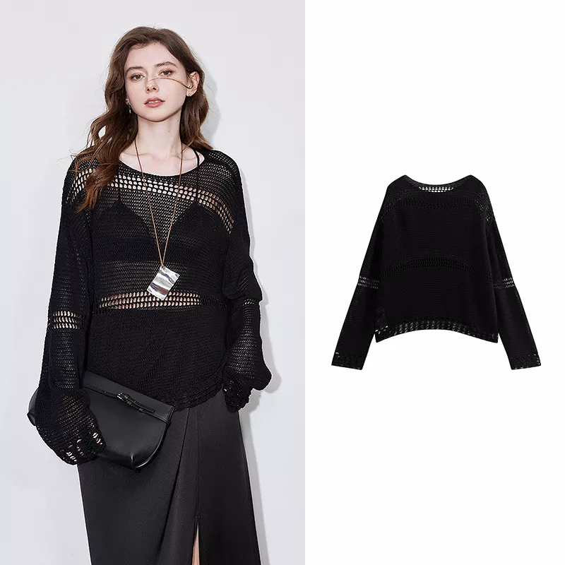 Women’s Knitted Hollow Out Linen Top – Chic Long Sleeve Spring Sweater