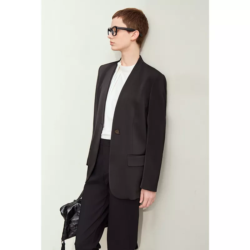 Designed with wide shoulder pads and a straight cut, this blazer creates a sharp, structured silhouette that exudes confidence and power. The single-button closure and regular fit provide a flattering and streamlined look, while the full-length sleeves ensure warmth and versatility for cooler months. This piece is a perfect balance of classic professionalism and contemporary style, making it a must-have for every fashion-forward woman.