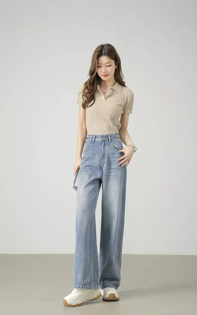 Crafted from 100% cotton with a non-stretch softener-treated fabric, these jeans offer a structured yet comfortable feel. The mid-rise waist provides a relaxed and flattering fit, while the wide-leg silhouette adds a touch of effortless elegance. Featuring a zipper fly closure, classic button detail, and multiple pockets for functionality, these jeans are as practical as they are stylish. The light-wash finish enhances the fresh, clean look, making them a versatile choice for any season.
