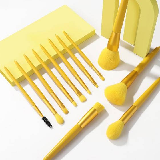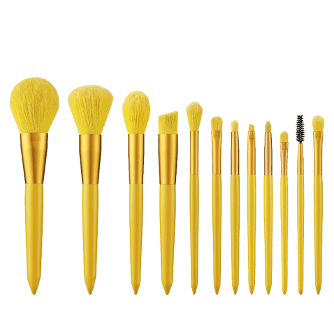This set of brushes is amazing. Bright yellow color exactly as the name says. 12 brushes for an amazing price. Combination of face and eye brushes help with a whole look. Set includes individual packaged brushes, care instructions and the type of each brush and its uses. They are soft but dense. Great addition to my collection.